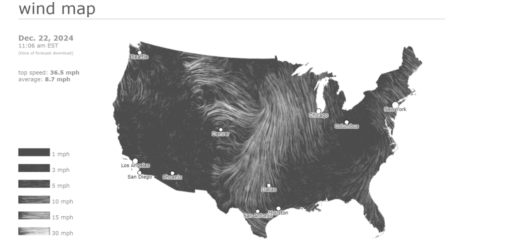 The real time wind map created by FERNANDA VIÉGAS and MARTIN WATTENBERG at (http://hint.fm/projects/wind/) displays the prevalent wind patterns in the U.S.